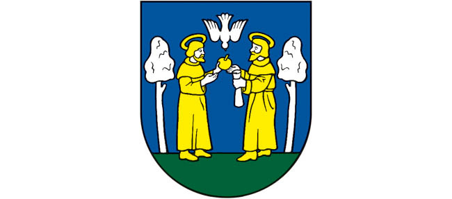 V modrom štíte v zelenej pažiti medzi dvoma striebornými prirodzenými stromami stojaci dvaja privrátení zlatovlasí a zlatobradí zlatoodetí, zlatými prstencami nimbovaní svätci, pravý v ľavici so zlatým jablkom, ku ktorému zlieta strieborná holubica, ľavý so strieborným rotulusom v ľavici.